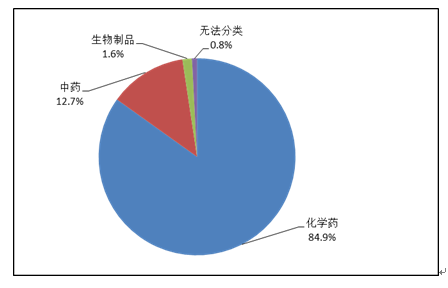 按照藥品類別統(tǒng)計,化學藥品占86.6%,中藥占12.6%,生物制品占0.8%?;瘜W藥品排名居前的藥品類別是抗感染藥、心血管系統(tǒng)用藥、腫瘤用藥、神經(jīng)系統(tǒng)用藥、電解質(zhì)、酸堿平衡及營養(yǎng)藥;中藥排名居前的藥品類別是理血劑、補益劑、祛濕劑、開竅劑、清熱劑。