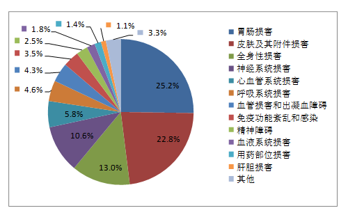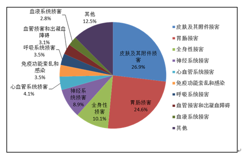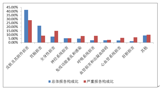 2019年國家基本藥物化學藥品和生物制品不良反應(yīng)/事件報告,按照藥品類別統(tǒng)計,報告數(shù)量排名前5位的分別是抗微生物藥、心血管系統(tǒng)用藥、抗腫瘤藥、激素及影響內(nèi)分泌藥、治療精神障礙藥;累及器官系統(tǒng)排名前5位的是皮膚及其附件損害、胃腸損害、全身性損害、神經(jīng)系統(tǒng)損害以及血液系統(tǒng)損害。